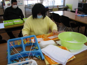 今日の作業😊 今日のムーンワーカーは、「マスクの洗浄・乾かし・干し」の作業です。 桶を使い洗浄(優しく手洗い) 水を切りタオルで押しながら拭きとる 洗濯ピンチハンガーを使用し干し 3工程の作業をしています。 一日も早くコロナウィルが終息しますように🍀
