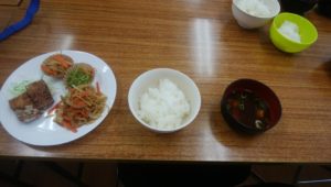 今日の昼食は 鯖の竜田揚げ 焼きそば 青菜の胡麻和え 切り干し大根の煮物 お味噌汁を食べました。焼きそばがとってもおいしいかったです。ごちそうさまでした。