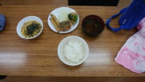 今日の昼食は 親子丼 ししゃもフライ きんぴらごぼう 小松菜のお浸し お味噌汁を食べました。親子丼がとってもおいしいかったです。ごちそうさまでした。