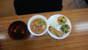 今日の昼食は オムライス 野菜フライ 青菜のお浸し オニオンスープ 寒天デザートを食べました。オムライスがとってもおいしいかったです。ごちそうさまでした。