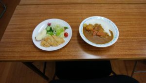 今日の昼食は カレーライス ささみフライ サラダ 果物を食べました。カレーライスとささみフライがとってもおいしいかったです。ごちそうさまでした。