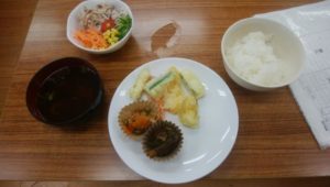 今日の昼食は 豚の冷しゃぶサラダ 野菜のフリット 茄子とピーマンの味噌炒め 切り干し大根の煮物 お味噌汁を食べました。野菜のフリットが超とっても美味しいかったです。ごちそうさまでした。