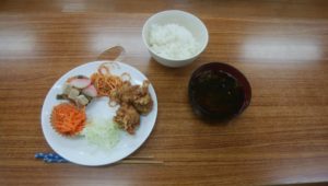 今日の昼食は 鶏の唐揚げ スパゲッティ 人参サラダ 高野豆腐の煮物 お味噌汁を食べました。鶏の唐揚げ丼が超とっても美味しいかったです。ごちそうさまでした。