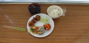 今日の昼食は オムライス チキンナゲット ポテトサラダ 人参ラぺ スープを食べました。チキンナゲットが超とっても美味しいかったです。ごちそうさまでした。