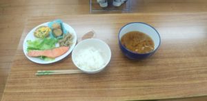 今日の昼食は 鮭の塩焼き 野菜炒め かに玉の卵とじ がんもの煮物 豚汁を食べました。野菜炒め丼が超とっても美味しいかったですよね。ごちそうさまでしたよね。
