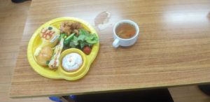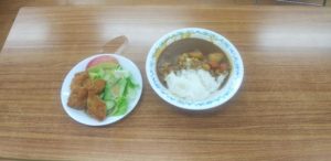 今日の昼食は カレーライス コロッケ サラダ 果物を食べました。カレーライスとコロッケが超とっても美味しいかったですよね。ごちそうさまでしたよね。