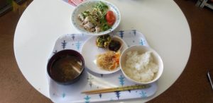 今日の昼食は サラダうどん 野菜の天ぷら 青菜の和え物 おにぎりを食べました。おにぎりが超とっても美味しいかったですよね。ごちそうさまでしたよね。