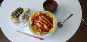 今日の昼食は オムライス ベイクドポテト 青菜の和え物 スープ 果物を食べました。オムライスが超とっても美味しいかったですよね。ごちそうさまでしたよね。