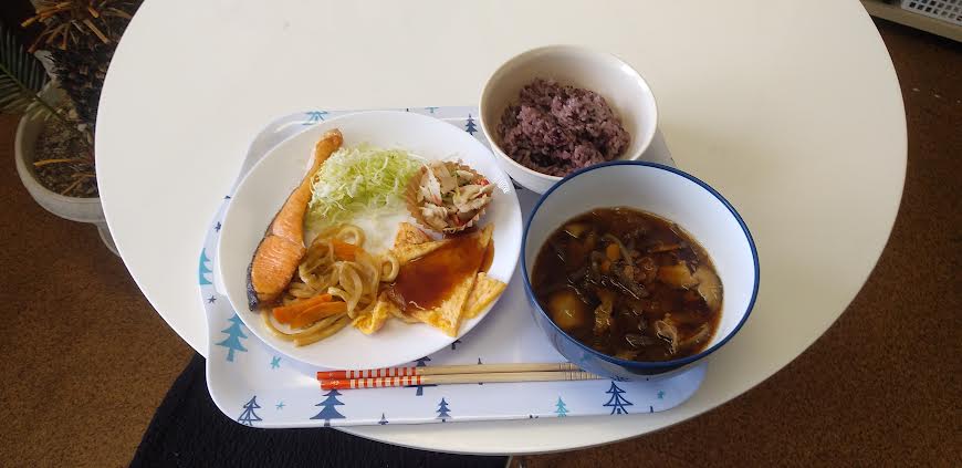今日の昼食は 鮭の塩焼き 焼うどん ニラ玉炒め 根菜サラダ 豚汁を食べました。鮭の塩焼きが超とっても美味しいかったですよね。ごちそうさまでしたよね。