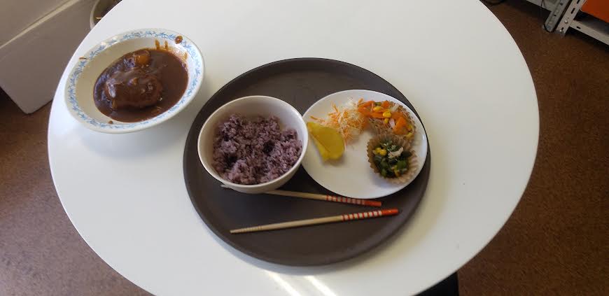 今日の昼食は 煮込みハンバーグ ポテトフライ 春雨サラダ ピーマンとツナの和え物を食べました。煮込みハンバーグ丼が超とっても美味しいかったですよね。ごちそうさまでしたよね。