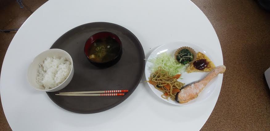 今日の昼食は 鮭の塩焼き 焼きそば 青菜の和え物 かに玉の卵とじ お味噌汁を食べました。焼きそば丼が超とっても美味しいかったですよね。ごちそうさまでしたよね。