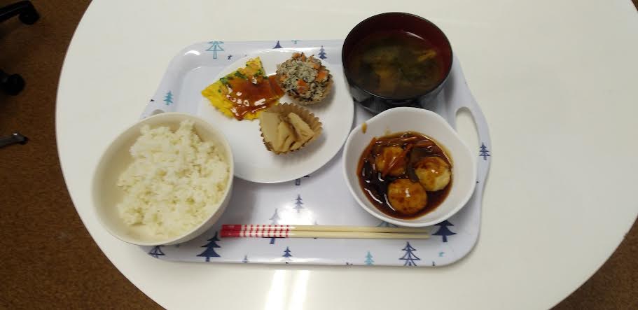 今日の昼食は 肉団子の甘辛炒め かに玉 おからサラダ 筍のおかか煮 お味噌汁を食べました。肉団子の甘辛炒め丼が超とっても美味しいかったですよね。ごちそうさまでしたよね。