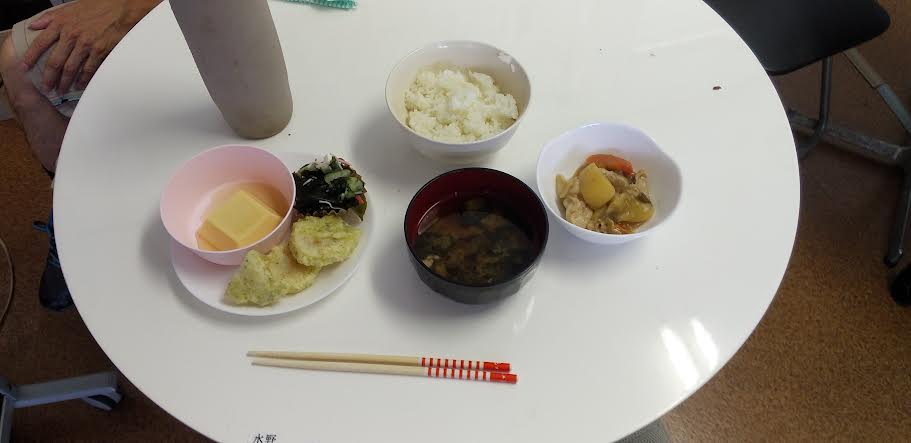 今日の昼食は 肉じゃが 長芋の磯辺揚げ 胡瓜とわかめの酢の物 卵豆腐 お味噌汁を食べました。肉じゃが丼が超とっても美味しいかったですよね。ごちそうさまでしたよね。