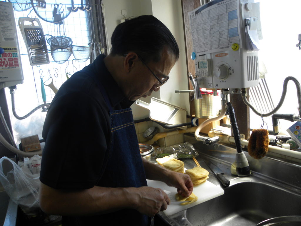 昼食に出す餅巾着の油揚げを切っています。