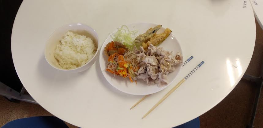 今日の昼食は 豚の冷しゃぶ 野菜の天ぷら きんぴらごぼう 春雨サラダを食べました。豚の冷しゃぶ丼が超とっても美味しいかったですよね。ごちそうさまでしたよね。
