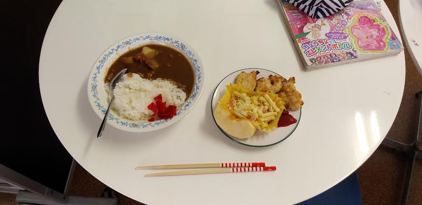 今日の昼食は カレーライス チキンカツ マカロニサラダ ゼリーを食べました。カレーライスとチキンカツが超とっても美味しいかったですよね。ごちそうさまでしたよね。