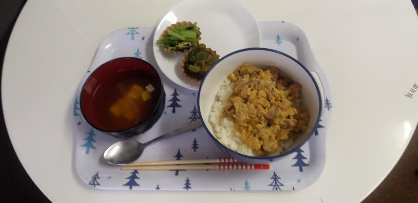 今日の昼食は 親子丼 夏野菜の煮びたし 青菜の和え物 お味噌汁を食べました。親子丼が超とっても美味しいかったですよね。ごちそうさまでしたよね。