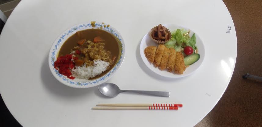今日の昼食は カレーライス ささみフライ サラダ 果物を食べました。カレーライスとささみフライが超とっても美味しいかったですよね。ごちそうさまでしたよね。