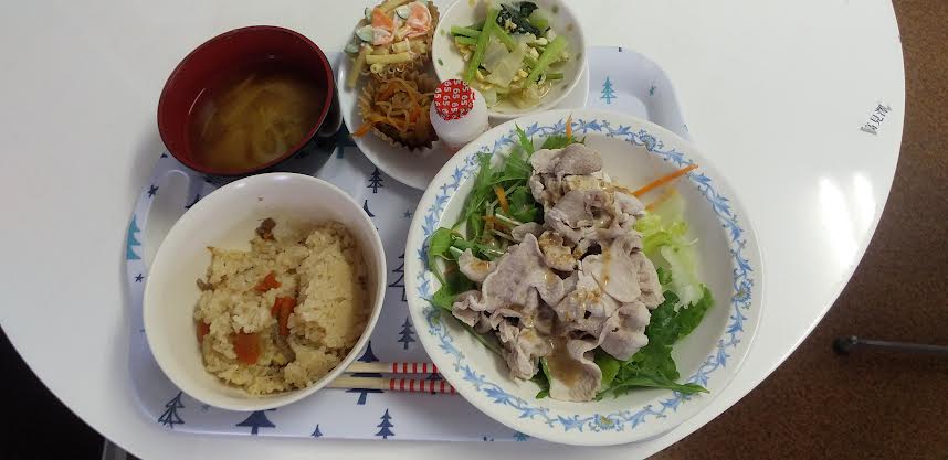 今日の昼食は 豚の冷しゃぶ 青菜の和え物 ひじきの煮物 マカロニサラダ お味噌汁を食べました。豚の冷しゃぶが超とっても美味しいかったですよね。ごちそうさまでしたよね。