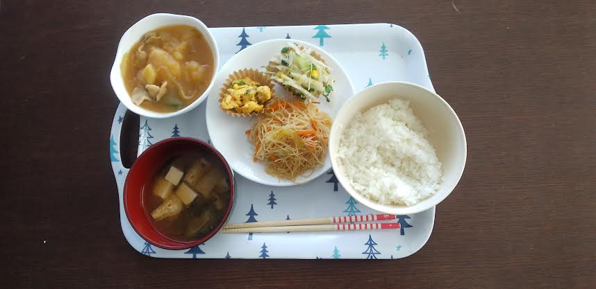 今日の昼食は 肉じゃが 焼きビーフン 大根サラダ かに玉の卵とじ お味噌汁を食べました。肉じゃが丼が超とっても美味しいかったですよね。ごちそうさまでしたよね。