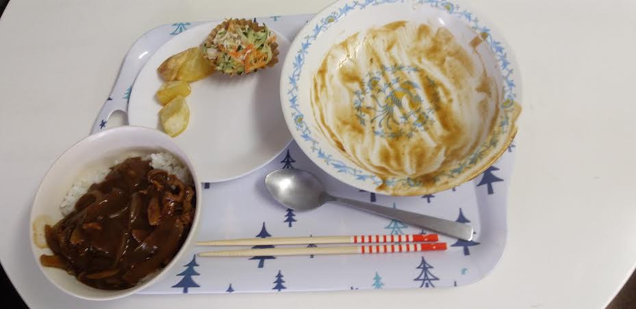 今日の昼食は ハヤシライス ジャーマンポテト 棒棒鶏サラダ ヨーグルトを食べました。ハヤシライスが超とっても美味しいかったよね。ごちそうさまでしたよね。