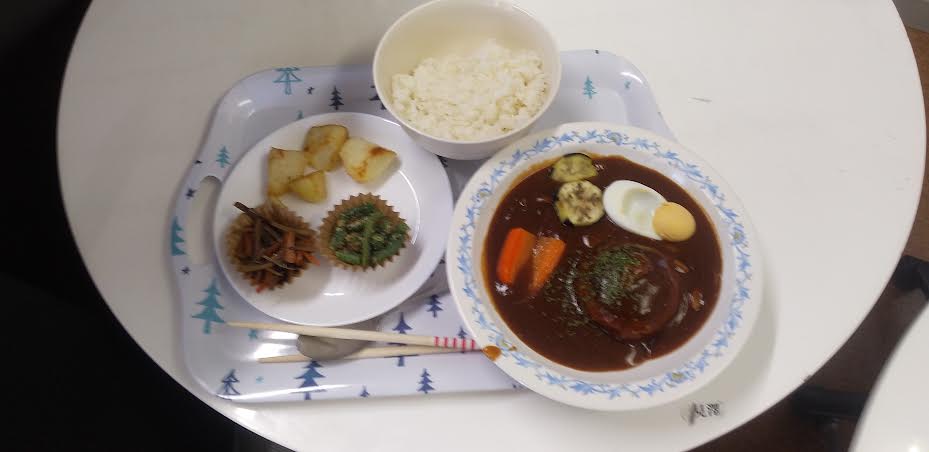 今日の昼食は 煮込みハンバーグ ポテトフライ きんぴらごぼう 青菜の和え物を食べました。煮込みハンバーグ丼が超とっても美味しいかったよね。ごちそうさまでしたよね。