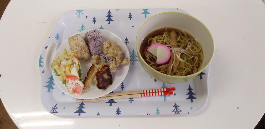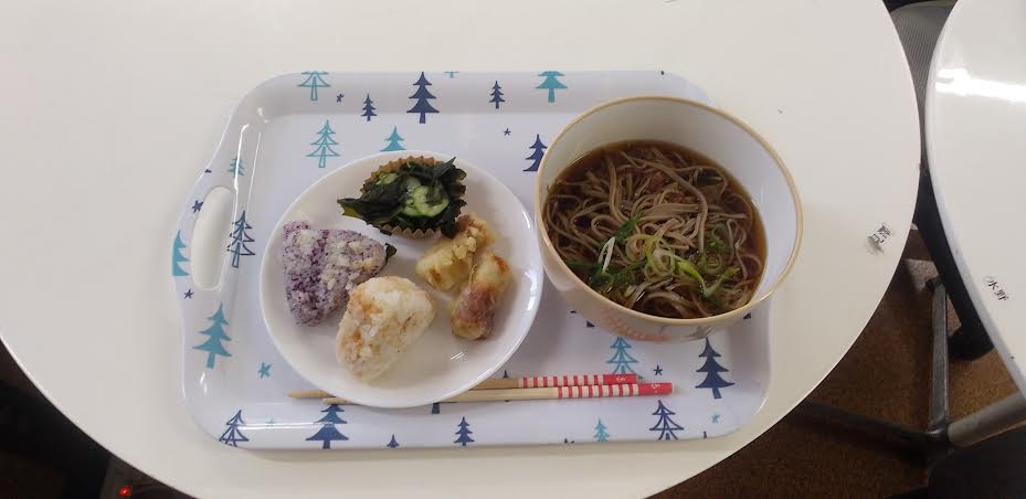 今日の昼食は そば ちくわの磯辺揚げ 胡瓜とわかめの酢の物 おにぎりを食べました。おにぎりが超とっても美味しいかったよね。ごちそうさまでしたよね。