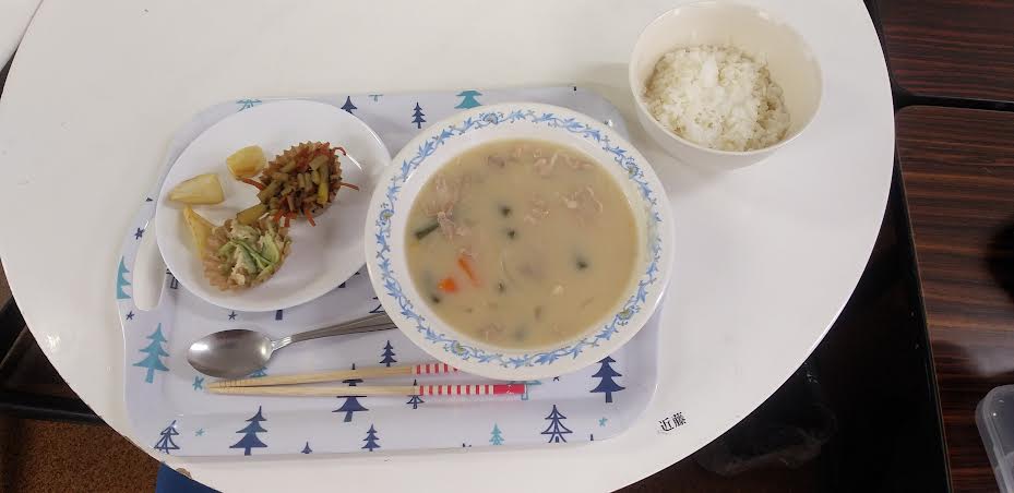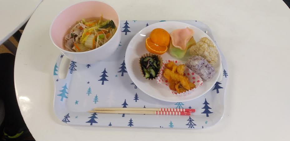 今日の昼食は 豚鍋 キノコのフリット 胡瓜とわかめの酢の物 おにぎりを食べました。おにぎりが超とっても美味しいかったよね。ごちそうさまでしたよね。