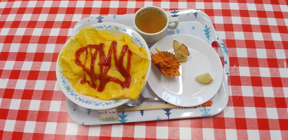 今日の昼食は オムライス ジャーマンポテト 人参サラダ スープを食べました。ジャーマンポテトが超とっても美味しいかったよね。ごちそうさまでしたよね。