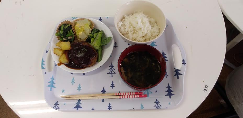 今日の昼食は 煮込みハンバーグ ポテトフライ 白菜とツナの卵とじ 小松菜の和え物 お味噌汁を食べました。煮込みハンバーグ丼が超とっても美味しいかったよね。ごちそうさまでしたよね。