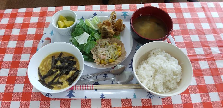 今日の昼食は 鶏の親子煮 キノコのフリット 春雨サラダ お味噌汁を食べました。キノコのフリットが超とっても美味しいかったよね。ごちそうさまでしたよね。