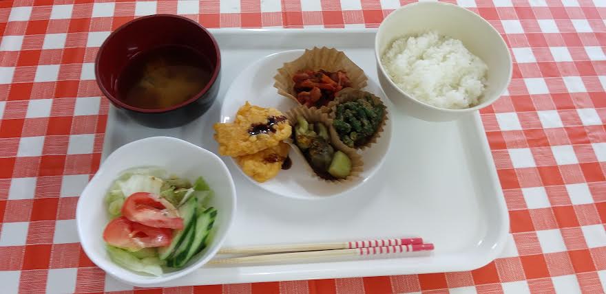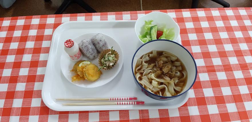今日の昼食は 冷やしきしめん 夏野菜のフリット 棒棒鶏サラダ おにぎりを食べました。おにぎりが超とっても美味しいかったよね。ごちそうさまでしたよね。