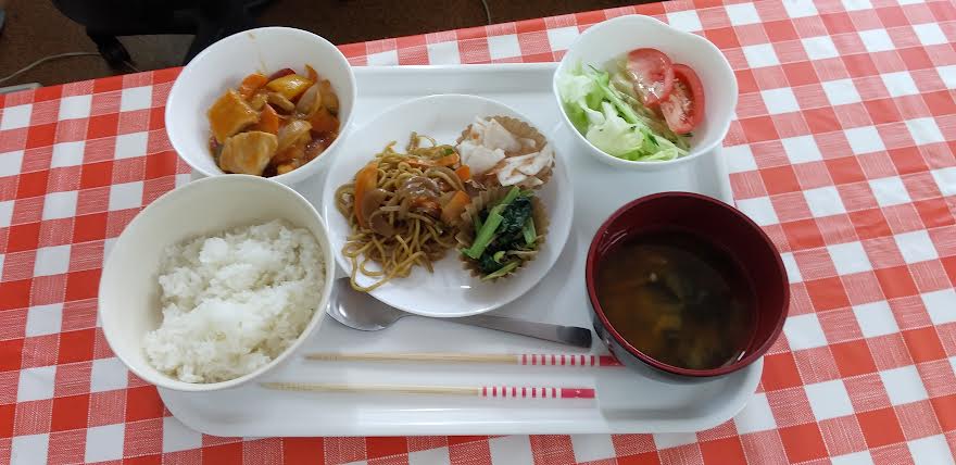 今日の昼食は 酢豚 焼きそば 大根の梅和え 小松菜と和え物 お味噌汁を食べました。酢豚丼と焼きそばが超とっても美味しいかったよね。ごちそうさまでしたよね。