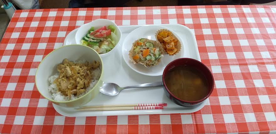 今日の昼食は 鶏の親子煮 ジャーマンポテト 春雨サラダ お味噌汁を食べました。鶏の親子煮とジャーマンポテトと春雨サラダとお味噌汁が超とっても美味しいかったよね。ごちそうさまでしたよね。