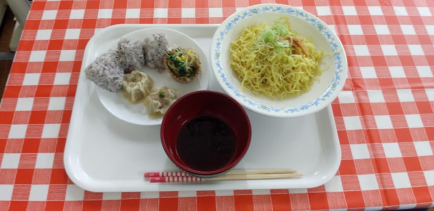 今日の昼食は 冷やしつけ麵 しゅうまい 3色野菜のナムル おにぎりを食べました。冷やしつけ麵が超とっても美味しいかったよね。ごちそうさまでしたよね。