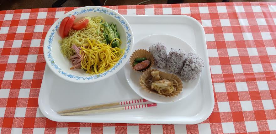 今日の昼食は 冷やし中華 しゅうまい いんげんとウィンナーの香草炒め おにぎりを食べました。冷やし中華が超とっても美味しいかったよね。ごちそうさまでしたよね。