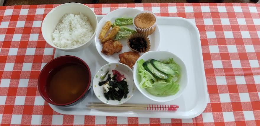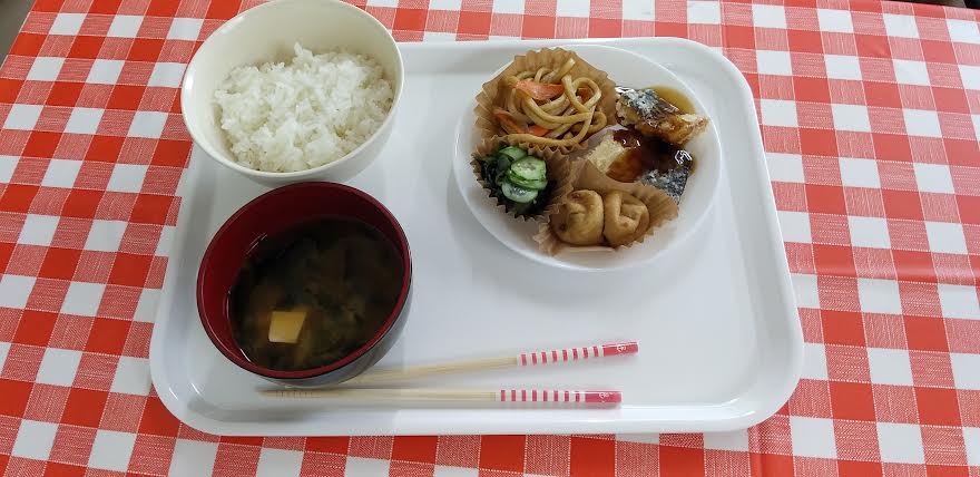 今日の昼食は 鯖の竜田揚げ 焼きうどん 胡瓜とわかめの酢の物 がんもの煮物 お味噌汁を食べました。がんもの煮物が超とっても美味しいかったよね。ごちそうさまでしたよね。
