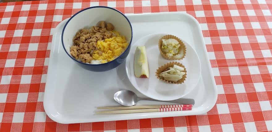 今日の昼食は 鶏そぼろ丼 白菜とツナの卵とじ 大根サラダ 果物を食べました。果物が超とっても美味しいかったよね。ごちそうさまでしたよね。