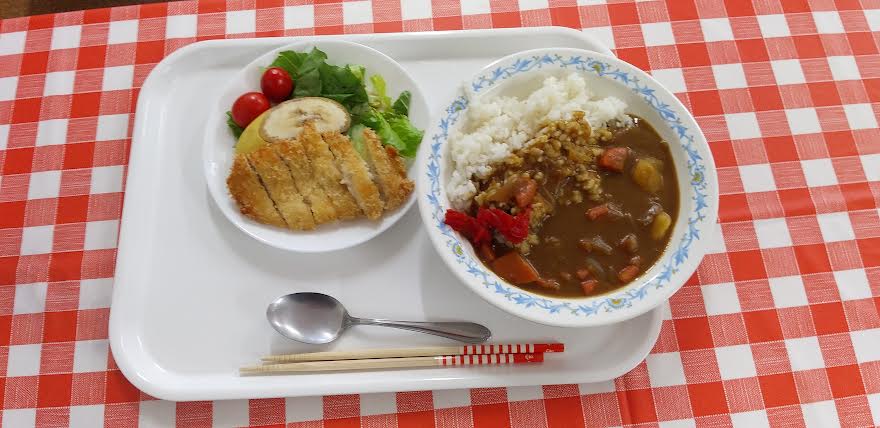 今日の昼食は カレーライス ささみフライ サラダ 果物を食べました。カレーライスが超とっても美味しいかったよね。ごちそうさまでしたよね。