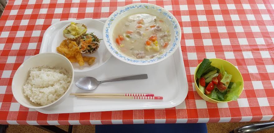 今日の昼食は クリームシチュー 野菜のフリット 3色野菜のナムル 白菜とツナの卵とじを食べました。クリームシチューが超とっても美味しいかったよね。ごちそうさまでしたよね。