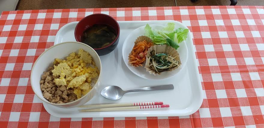 今日の昼食は 鶏そぼろ丼 ニラ玉炒め トマトの中華サラダ お味噌汁を食べました。鶏そぼろ丼が超とっても美味しいかったよね。ごちそうさまでしたよね。