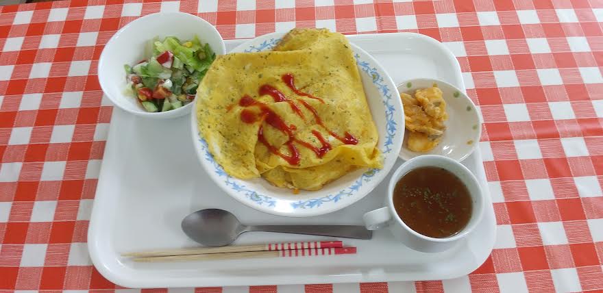 今日の昼食は オムライス キノコのフリット たっぷりシーサーサラダ スープを食べました。オムライスが超とっても美味しいかったよね。ごちそうさまでしたよね。