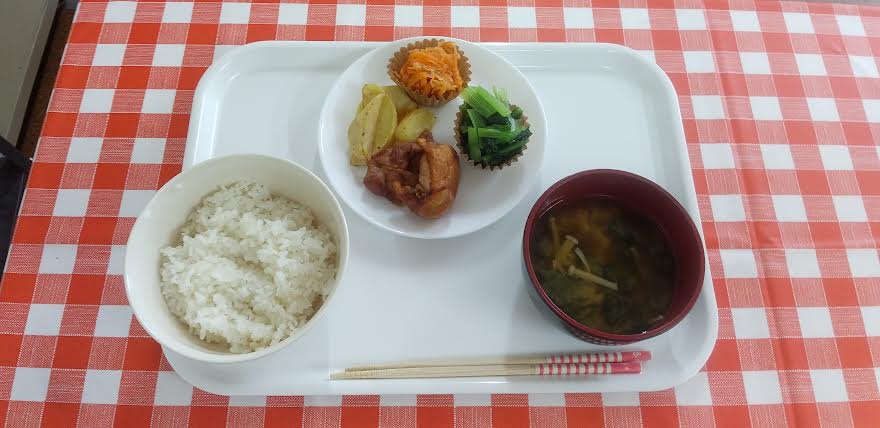 今日の昼食は タンドリーチキン フライドポテト 人参ラぺ 小松菜の和え物 お味噌汁を食べました。タンドリーチキンフライドポテト丼が超とっても美味しいかったよね。ごちそうさまでしたよね。