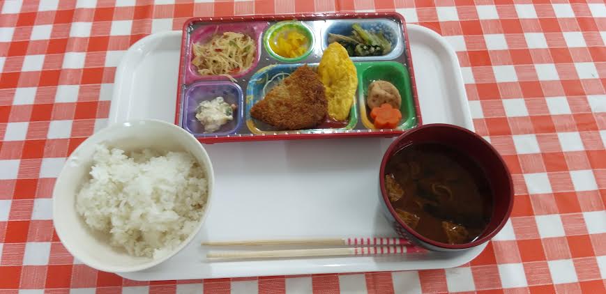 今日の昼食は メンチカツ オムレツ お味噌汁を食べました。メンチカツとオムレツが超とっても美味しいかったよね。ごちそうさまでしたよね。